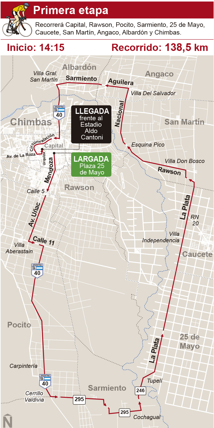 Además, el recorrido incluirá dos Metas Sprint bien definidas: la primera en calle Rawson, frente a Bodega Peñaflor, en San Martín, ubicada en el kilómetro 94,4, y la segunda en calle Nacional y Santa María de Oro, en Angaco, en el kilómetro 111,5.